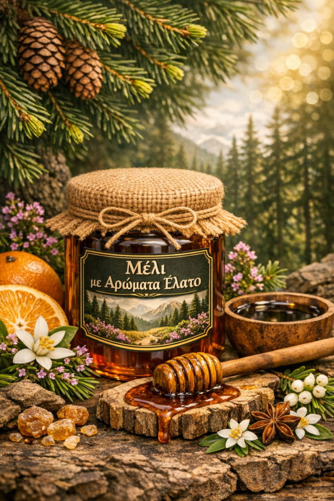 Το μελί αυτό δεν συλλέγεται από άνθη, αλλά από ένα μελίτωμα που παράγουν μικροοργανισμοί στον κορμό του ελάτου. ‘Ένα μέλι πυκνόρρευστο, με χαρακτηριστικό κοκκινωπό χρώμα. Το μέλι από το έλατο είναι ξεχωριστό κυρίως λόγω της χαμηλής περιεκτικότητας του σε γλυκόζη. Έχει ουδέτερο άρωμα και πικάντικη γεύση, που θυμίζει καραμέλα βουτύρου.