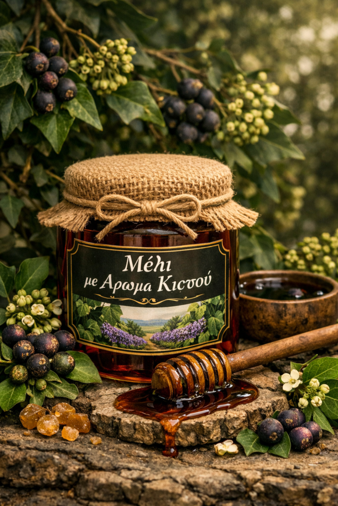 Το μέλι από κισσό είναι ένα ιδιαίτερο και λιγότερο γνωστό ελληνικό μέλι, που παράγεται από το φυτό Κισσός (Hedera helix) και ξεχωρίζει για τη δυνατή του προσωπικότητα. Έχει συνήθως σκούρο χρώμα και πλούσια, ελαφρώς πικρή γεύση, ενώ το άρωμά του είναι έντονο και χαρακτηριστικό. Κρυσταλλώνει σχετικά γρήγορα, αποκτώντας πιο συμπαγή υφή, κάτι που δείχνει τη φυσικότητά του. Είναι πλούσιο σε αντιοξειδωτικά και παρουσιάζει ήπιες αντιβακτηριακές ιδιότητες, συμβάλλοντας στην ενίσχυση του οργανισμού. Παραδοσιακά χρησιμοποιείται για την ανακούφιση του λαιμού και του βήχα, ενώ βοηθά και στη γενικότερη τόνωση του ανοσοποιητικού. Ιδανικό για κατανάλωση σκέτο ή σε συνδυασμό με γιαούρτι και ξηρούς καρπούς.